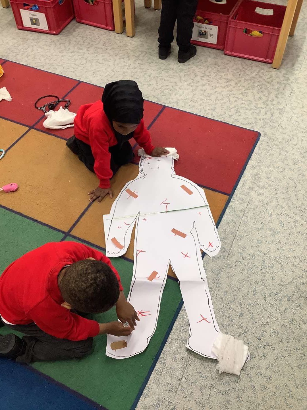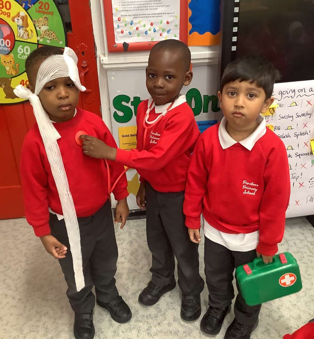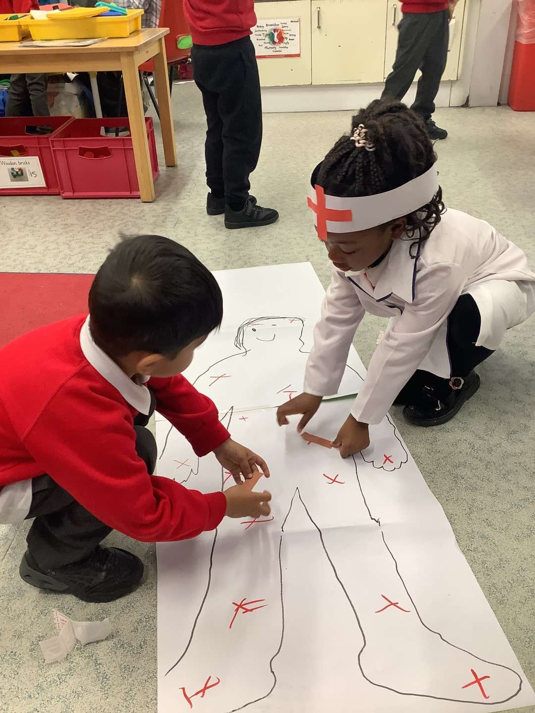 Last week we had a special week, where we looked at different jobs and the types of careers we could have in the future. On Friday, we had the opportunity to work with Reception for our ‘House Challenge’ and looked at becoming doctors and nurses. We made hats and learnt about how medical professionals help others. As you can see from the photos, we had a chance to use bandages and put plasters on areas which we pretended were hurt.