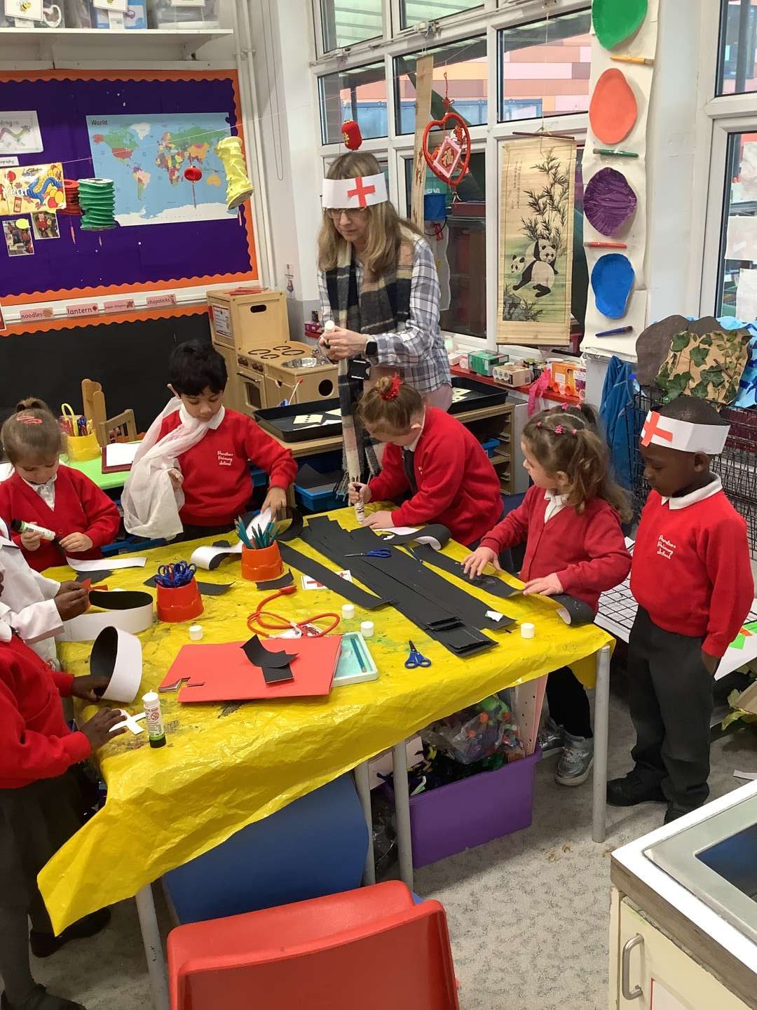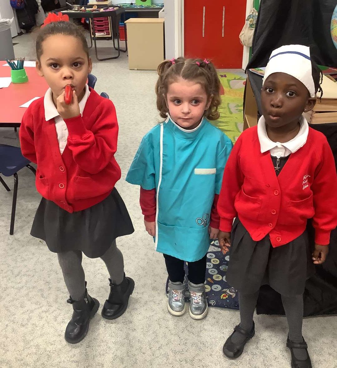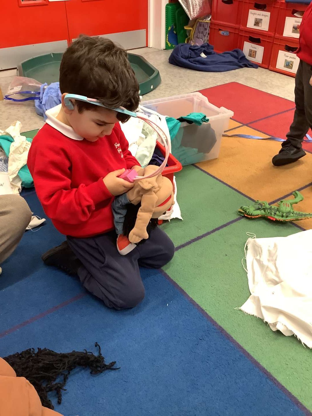 Last week we had a special week, where we looked at different jobs and the types of careers we could have in the future. On Friday, we had the opportunity to work with Reception for our ‘House Challenge’ and looked at becoming doctors and nurses. We made hats and learnt about how medical professionals help others. As you can see from the photos, we had a chance to use bandages and put plasters on areas which we pretended were hurt.