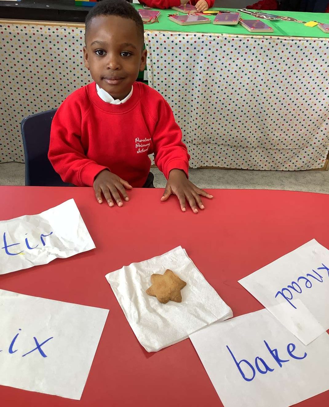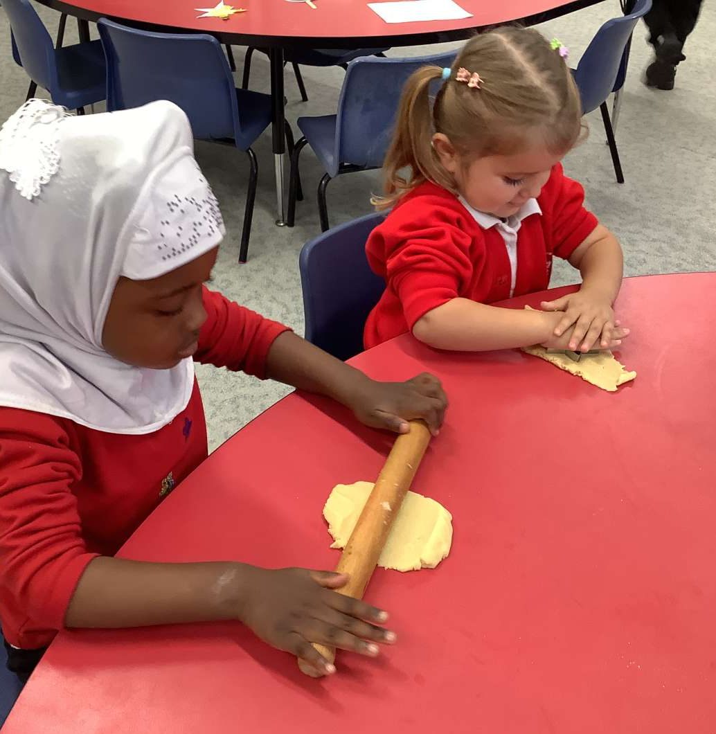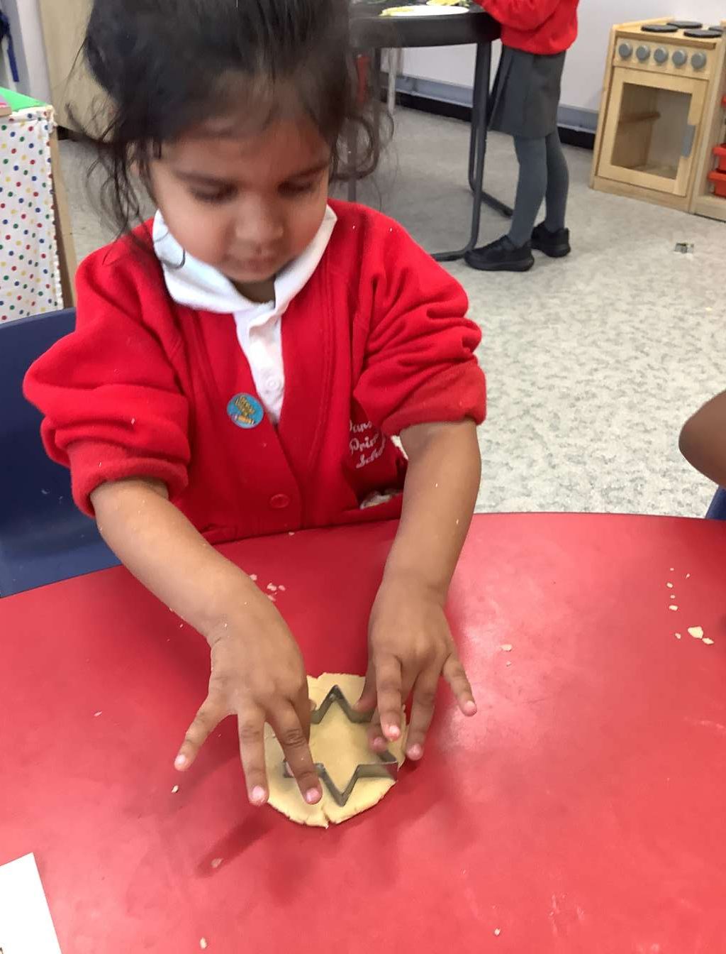 Our nursery rhyme this week is ‘Twinkle Twinkle Little Star.’ We enjoyed singing and learning the rhyme, as well as completing lots of different activities, such as making stars and going on a star hunt. We also took this opportunity to do our first cooking activity; making star biscuits. It was a lot of fun to mix the ingredients to make the dough. Once mixed, we rolled it out using a rolling pin and then cut out the biscuits using a star-shaped cutter.