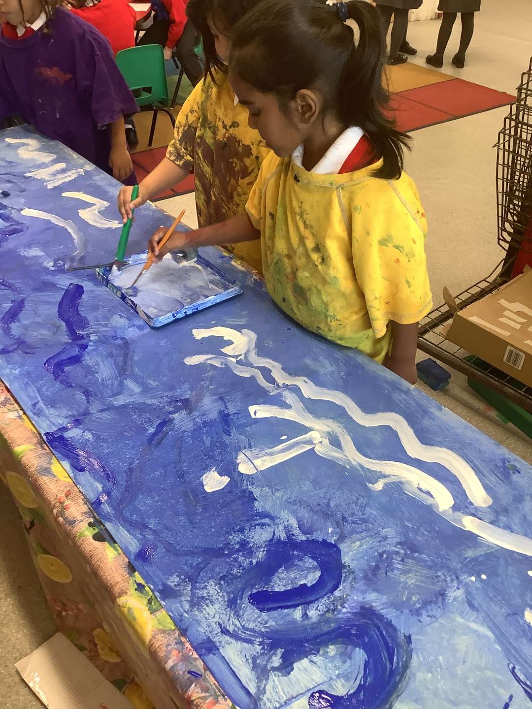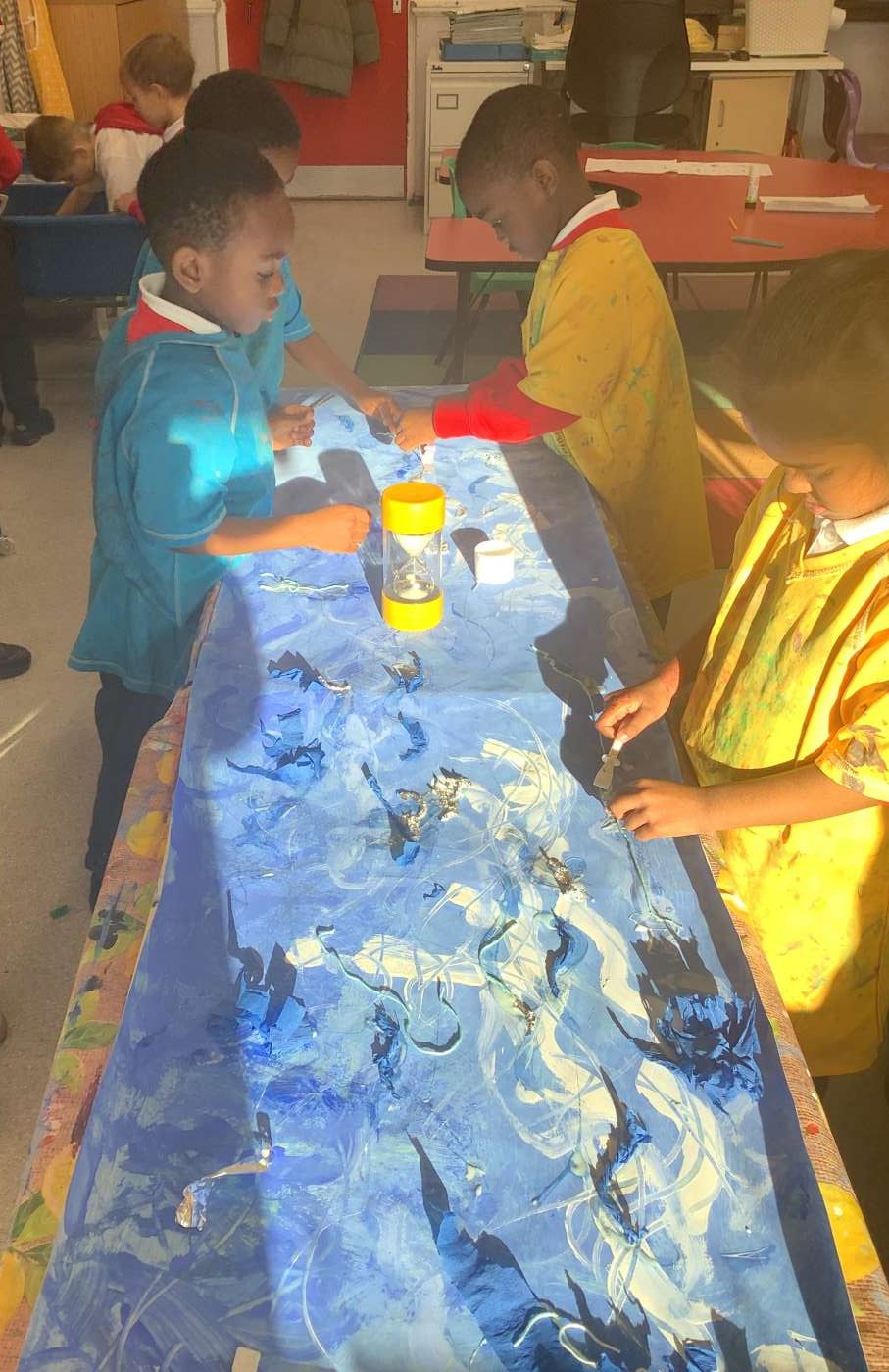 In English Hedgehog Class have been reading ‘Mr Gumpy’s Outing’. Today we all worked together to produce a mixed media picture of Mr Gumpy’s river. First we printed the background with sponges. We then thought about how rivers flowed and moved and we painted wavy lines into the background. Finally we added texture by twisting crepe paper and silver foil to show how rivers shine and glisten in the sun. Hedgehog class showed real teamwork and cooperation when producing their picture.