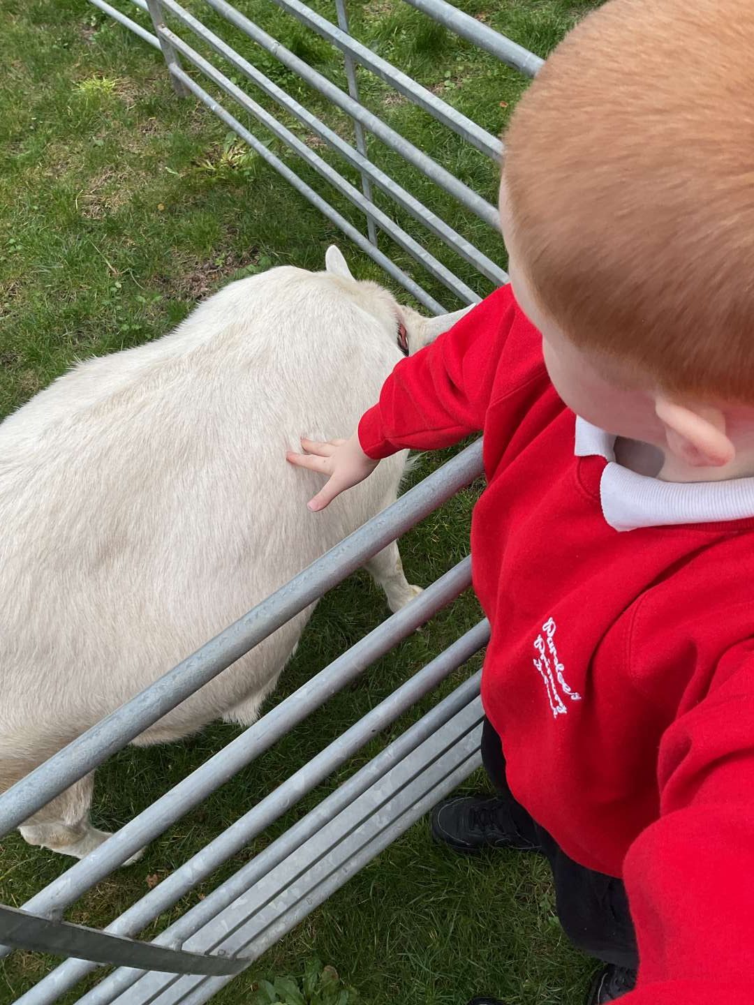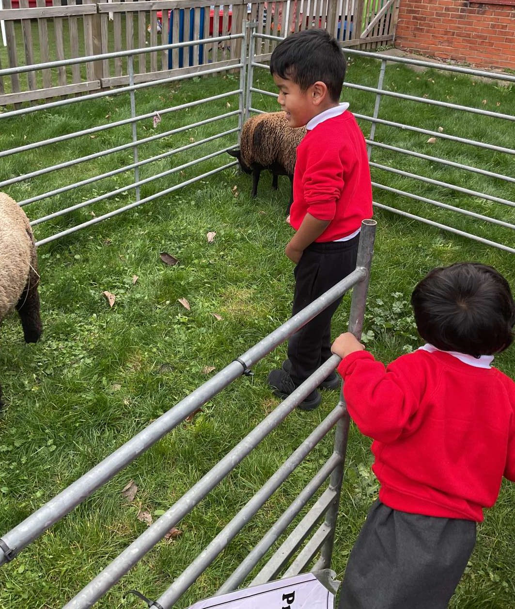 This week, Wellgate Farm came to visit. We all went to see the animals in the school garden. There were sheep, goats, ducks, chickens and other animals. The farmer told us all about the animals and how to look after them. Some of us enjoyed just looking at the animals while others stroked and fed them.