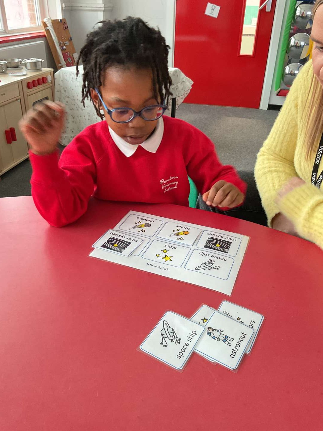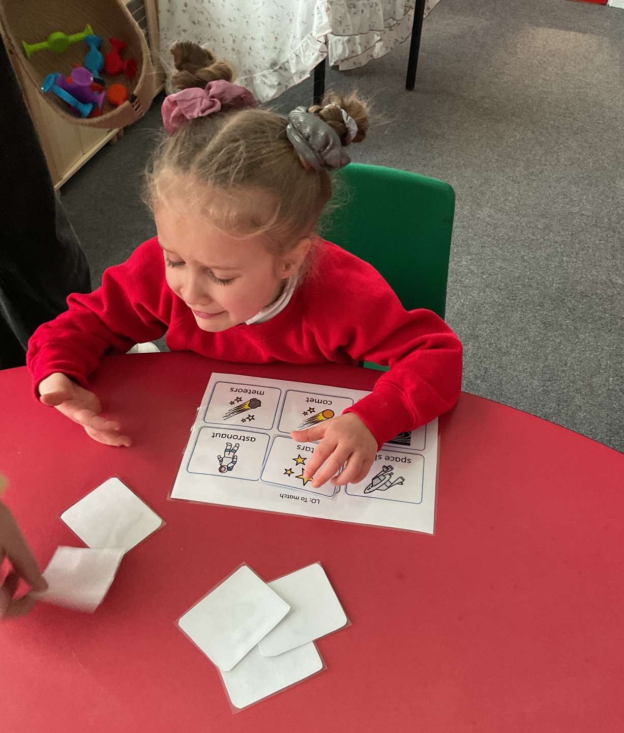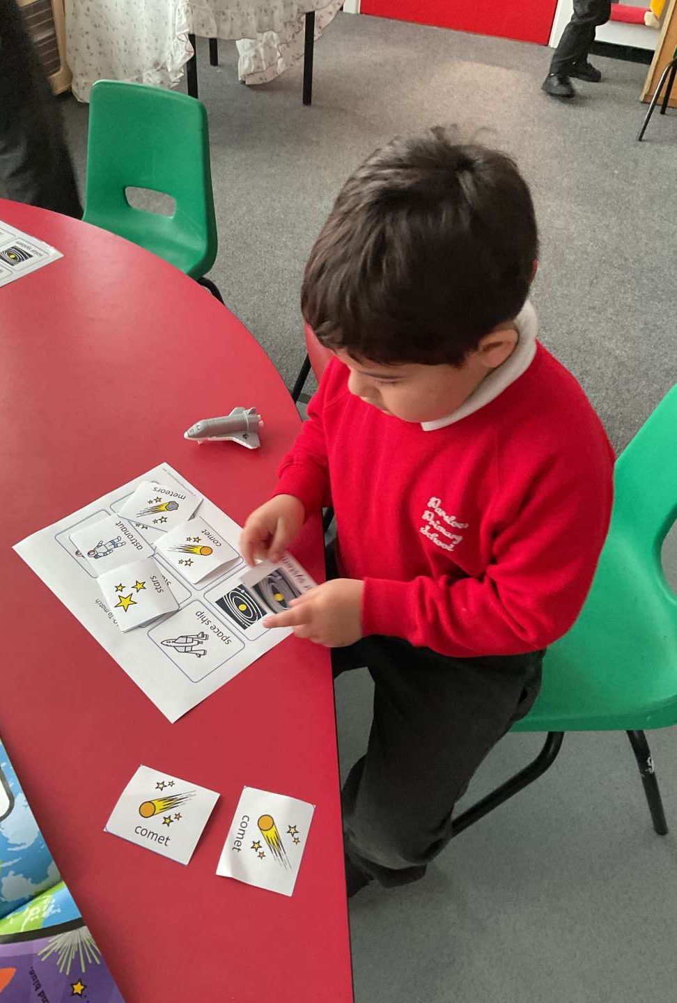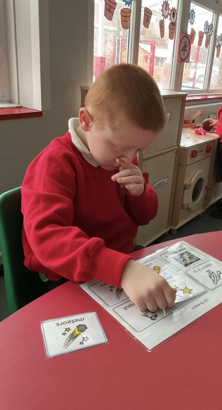 This week in Literacy, as part of our Space Explorers topic we matched the different items found in space and in our sensory story book, Exploring Space. We matched a space ship, stars, an astronaut as well as other things that might be found in space. We tried hard to name them too.