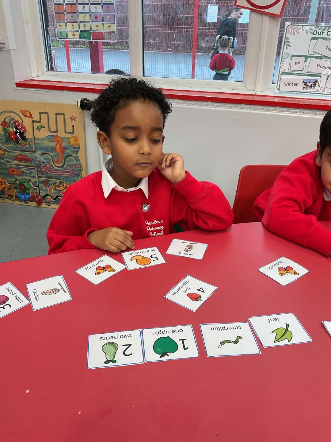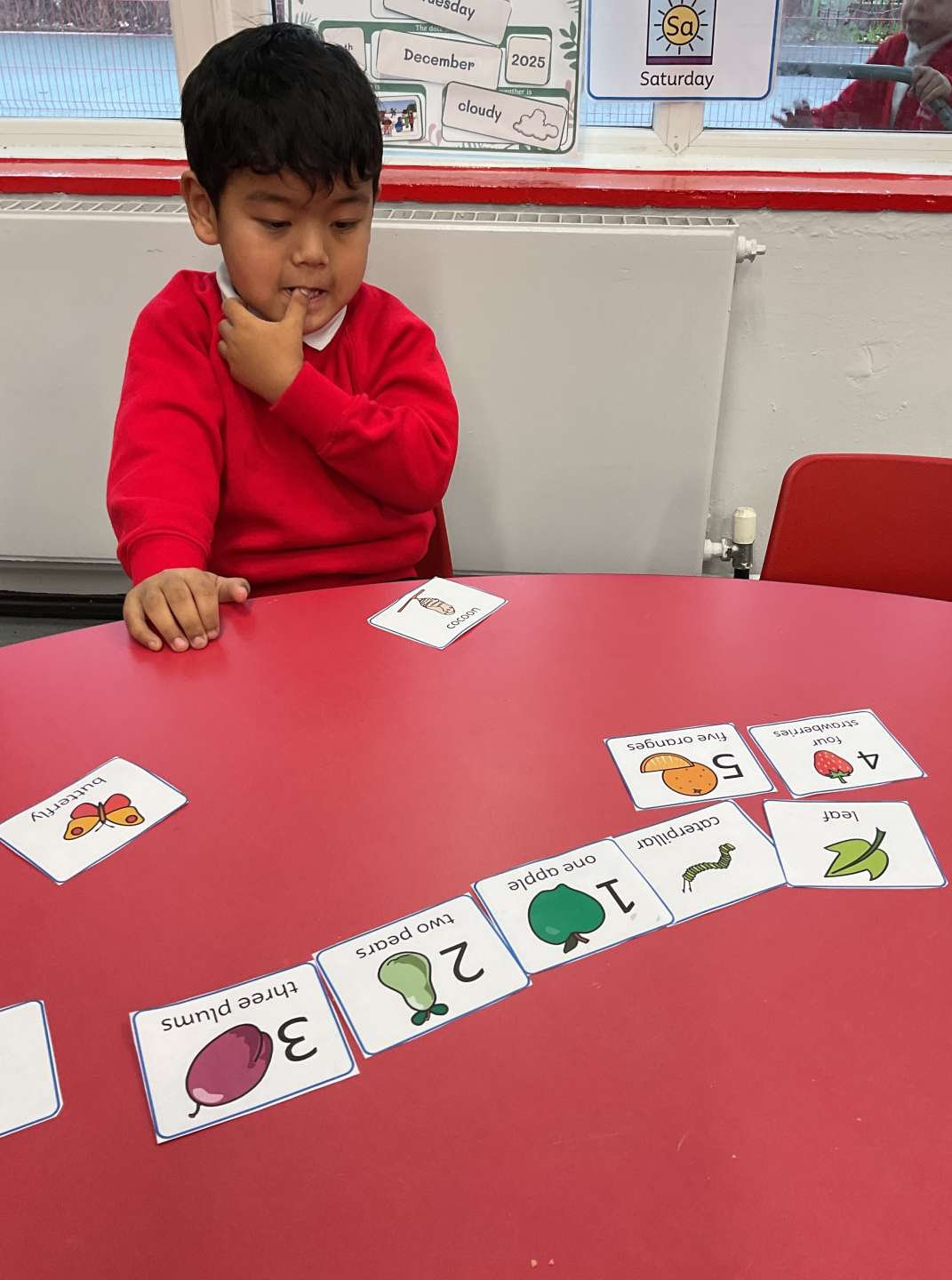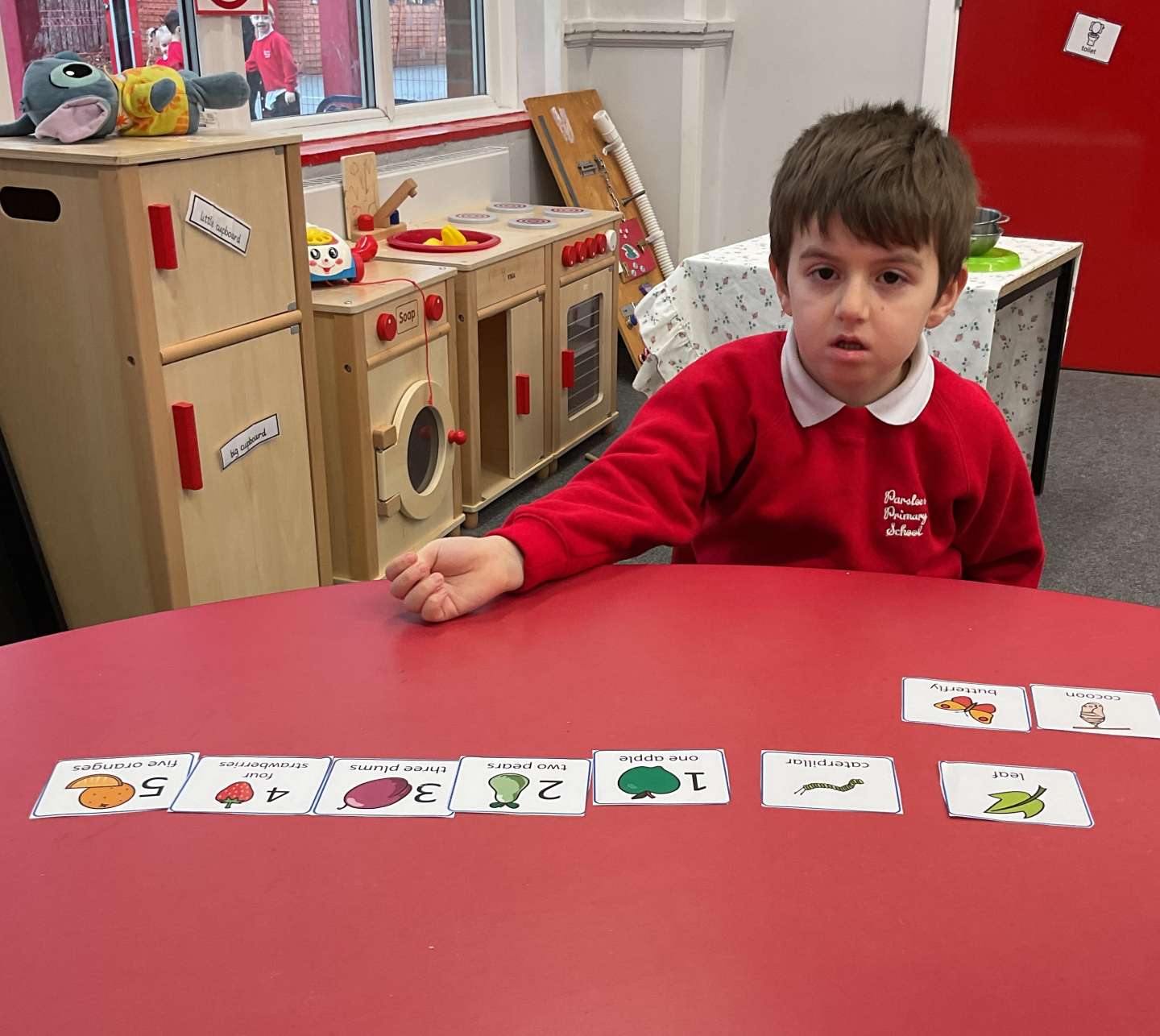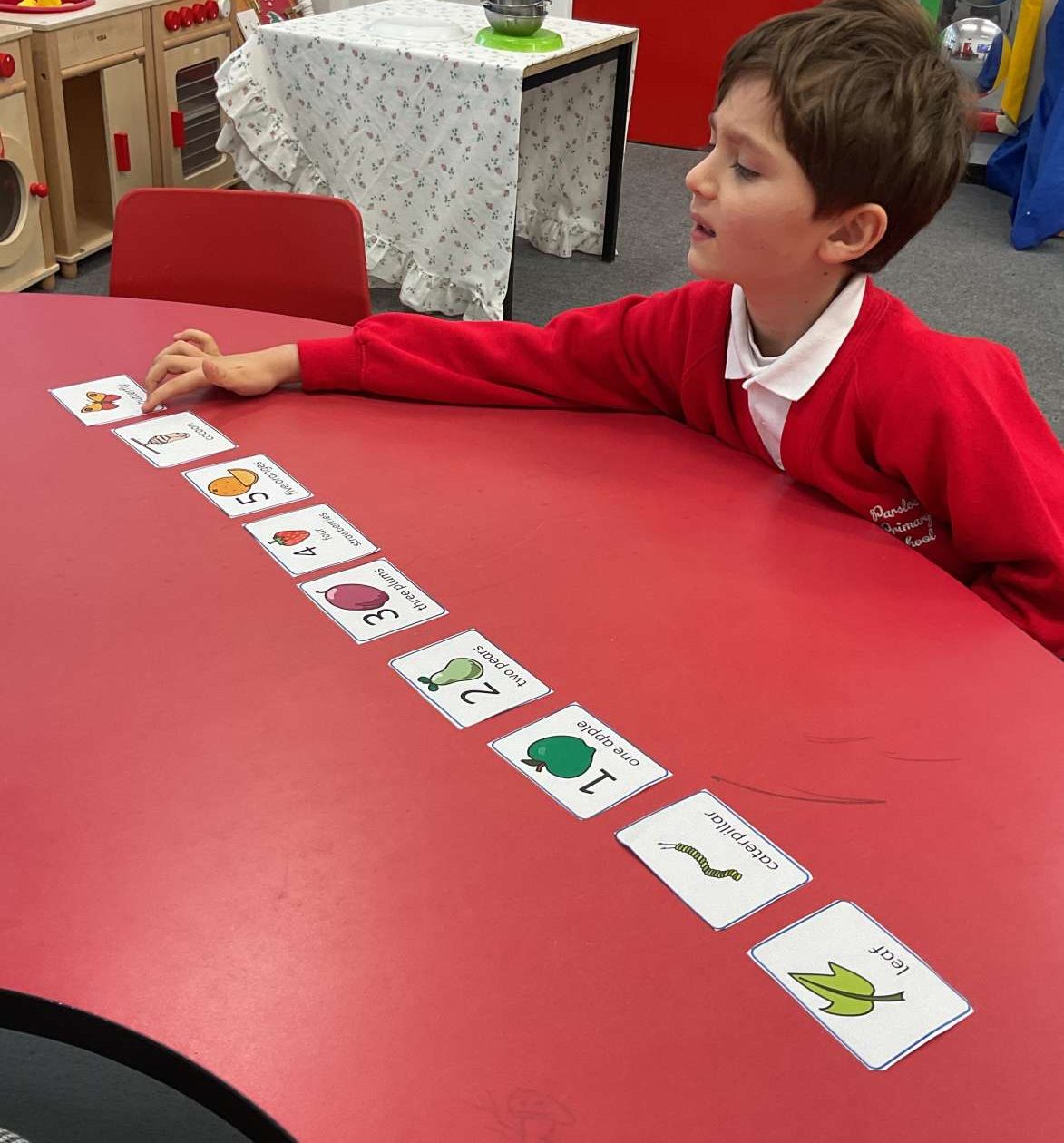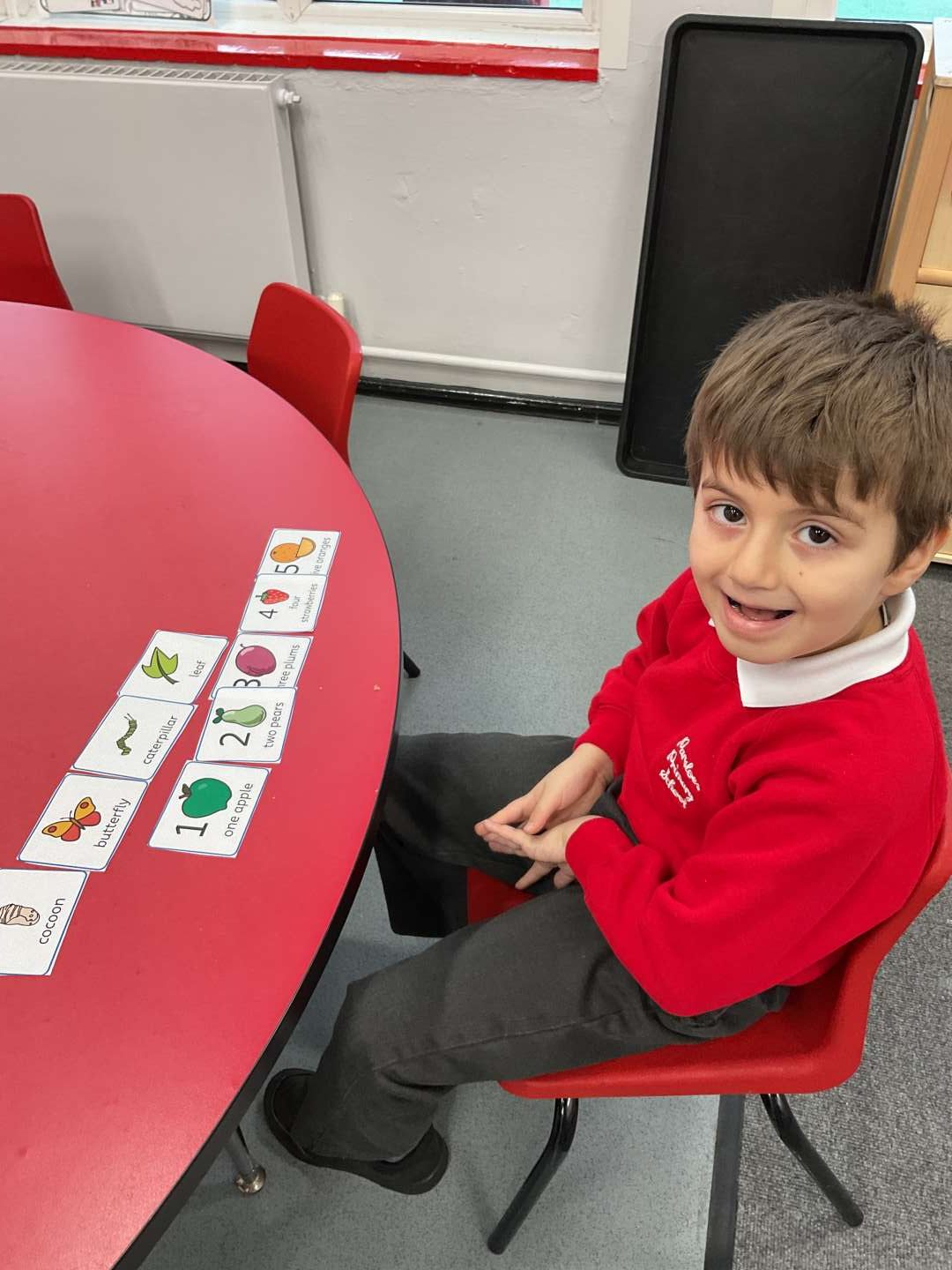 This week in the ARP, we have been thinking about our story, The Very Hungry Caterpillar. As we listened to the story, we had to think about what happened when. At the beginning of the week, we used props to order the story and as the week went on, we could sequence the story using pictures. Lots of us remembered the words too.