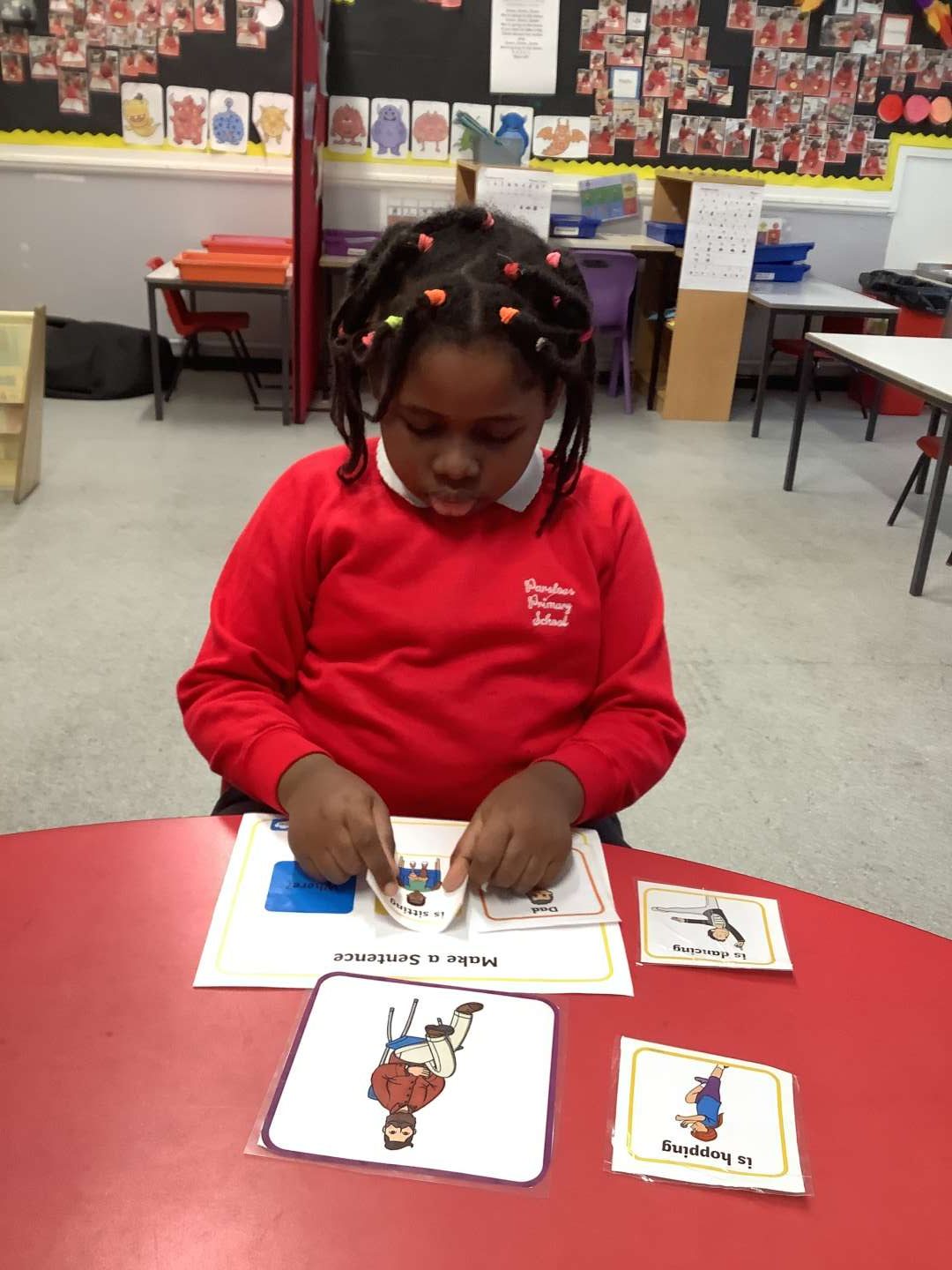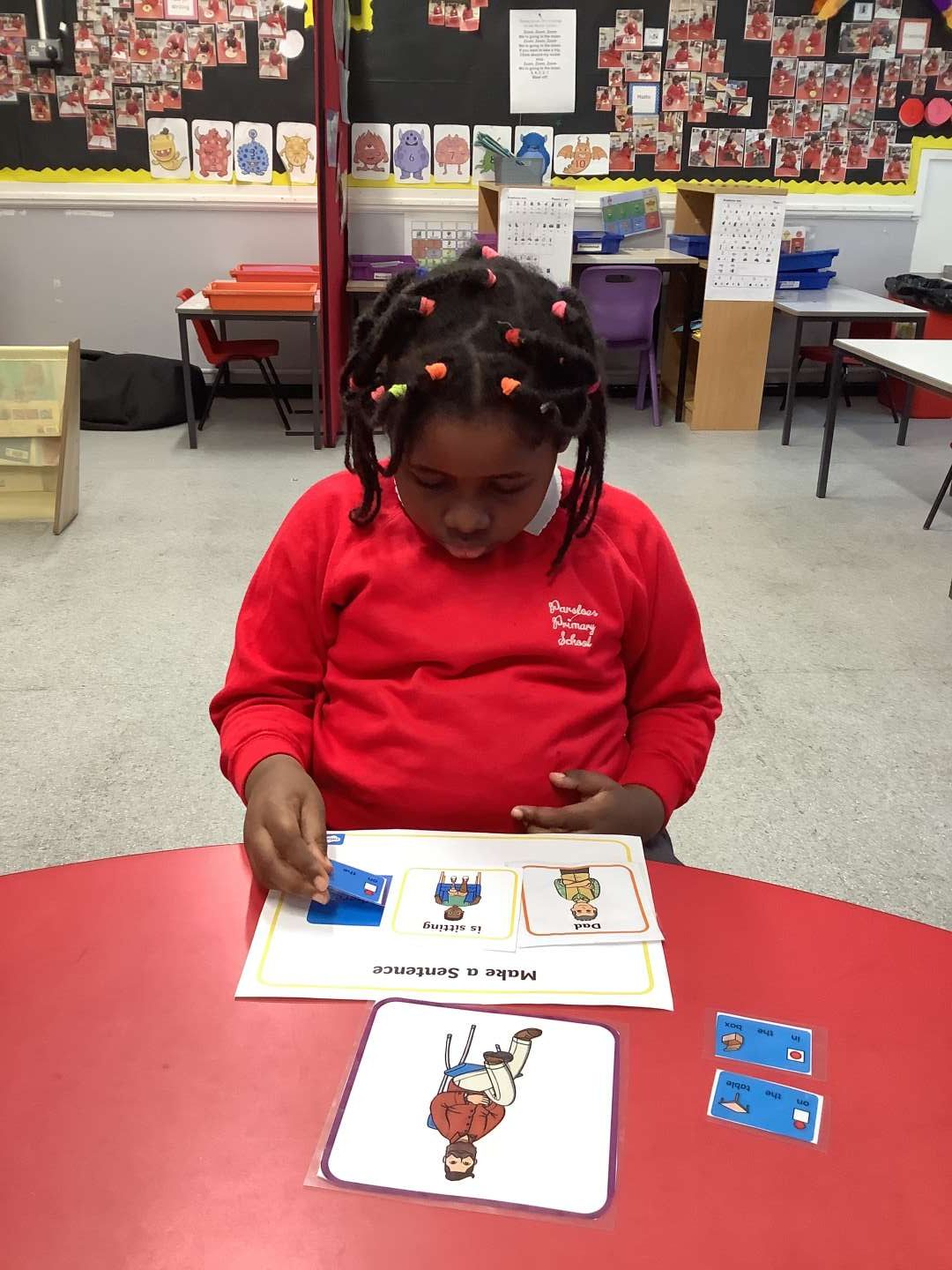 Every Week in the Meadow, we practise making sentences about a picture using Colourful Semantics. Children independently put the sentence together with cards and then we orally practice several times. This helps with our speech and language and helps with our understanding of what is needed in a sentence. Also it helps with our comprehension of a picture, understanding what is happening in a picture.