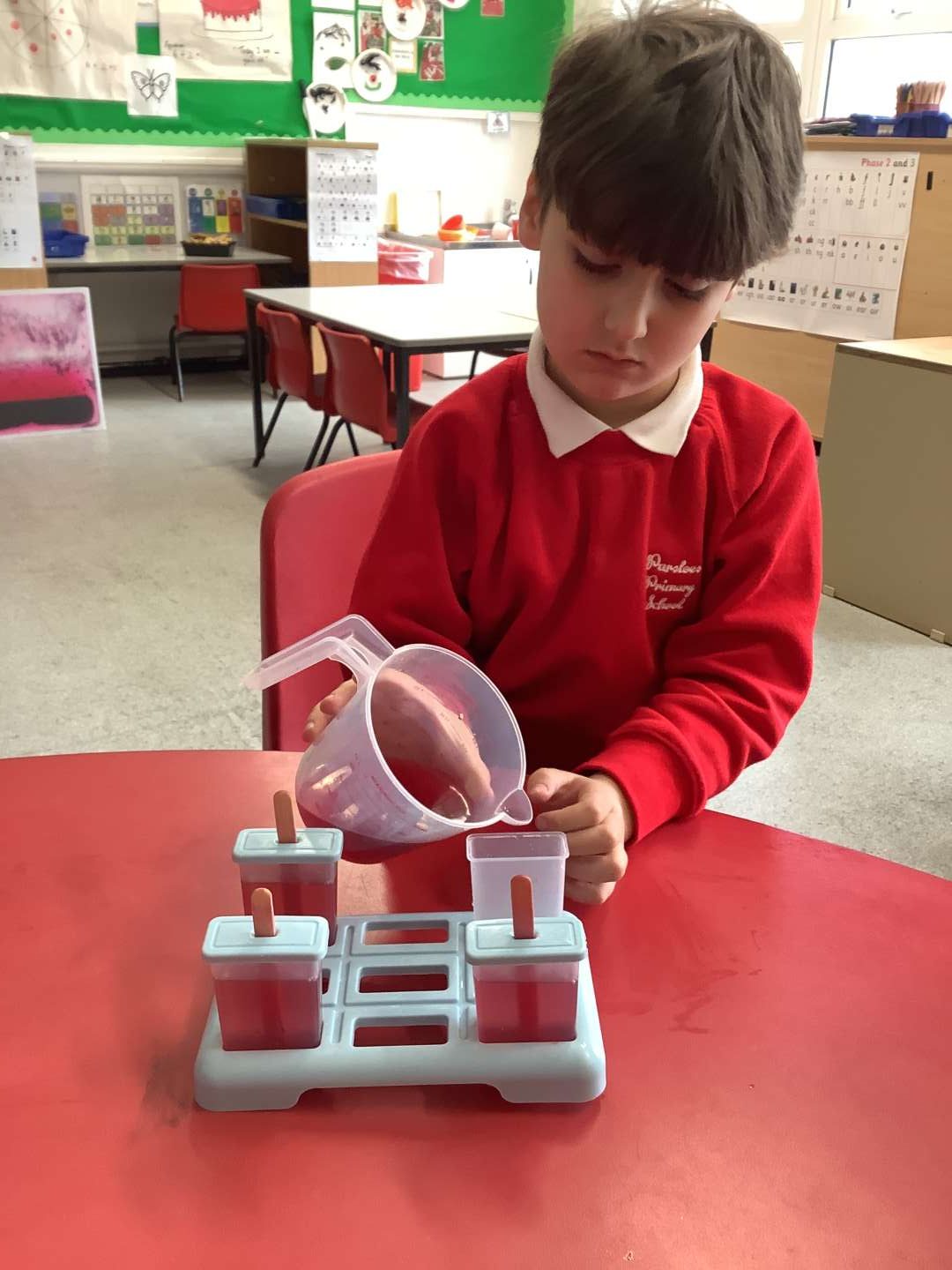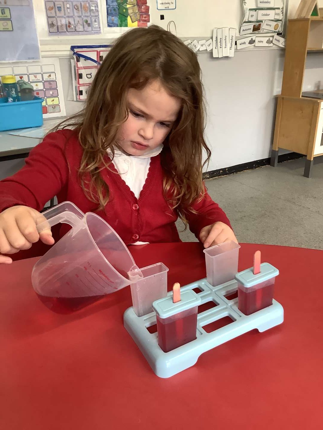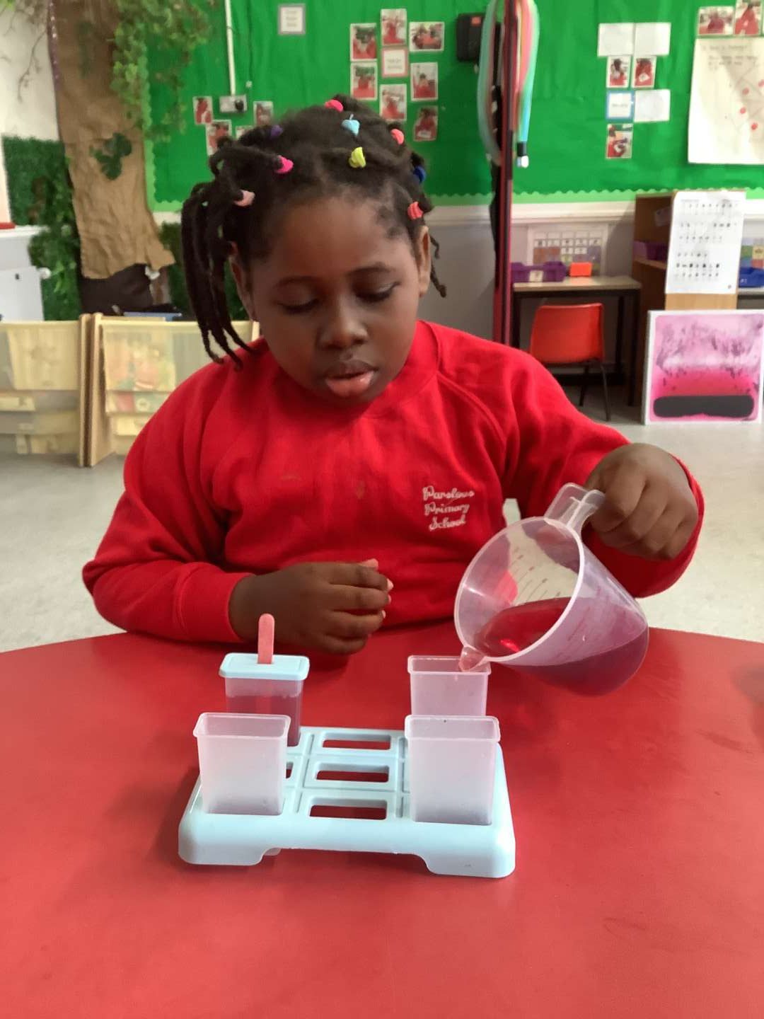 During our Understanding the World lesson this week, we explored frozen vegetables and discussed what happens as the vegetables melt, like the ones in Supertato. We also looked at how things are frozen. We made blackcurrant squash, put the liquid into lolly moulds and put them in the freezer. The next day when they were hard and frozen were we able to enjoy them and see them melt.