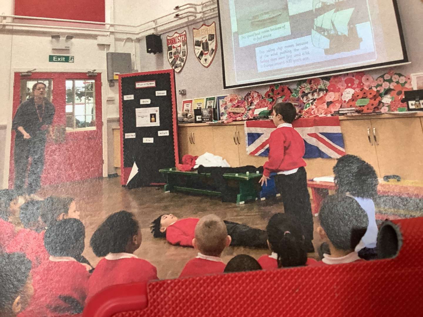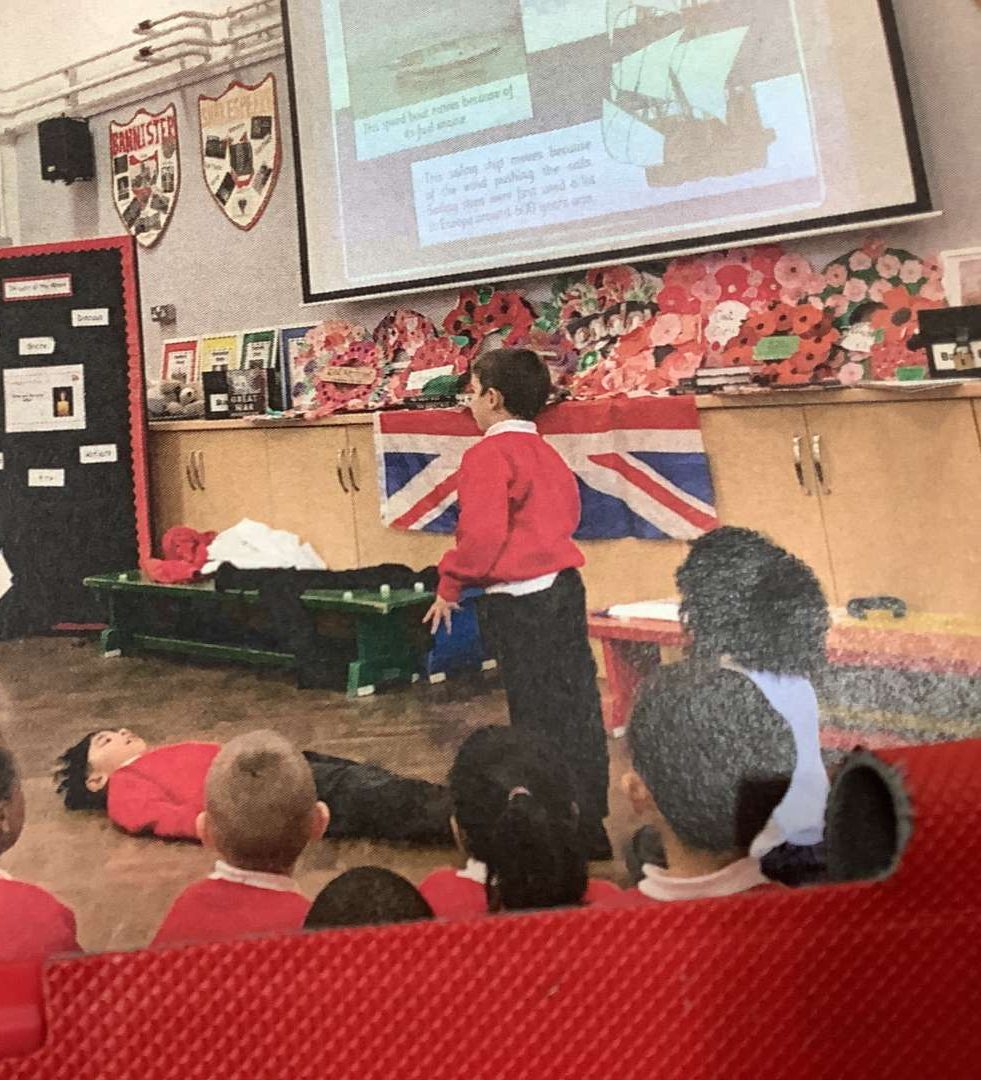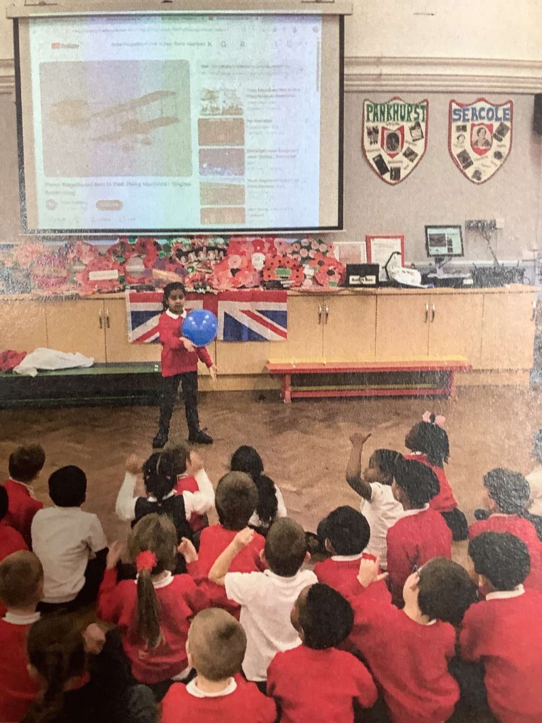 This week, we had an exciting day celebrating our entry point for our new topic ‘On the Move’. We transformed the hall door into the entrance of a time machine. We went back in time and placed the Year One teachers and some of the children on a timeline, according to when they were born. This really helped to develop the children’s understanding of time and supported their understanding of the concepts ‘youngest’ and ‘eldest’. We then learned about how transport has changed through history. We enjoyed using some of our new gymnastics skills to make different types of transport with our bodies. Finally, we had a special visitor from the past, Wilbur Wright! Wilbur Wright and his brother Orville are credited with flying the first successful aeroplane in 1903. We placed Wilbur and Orville on our timeline.