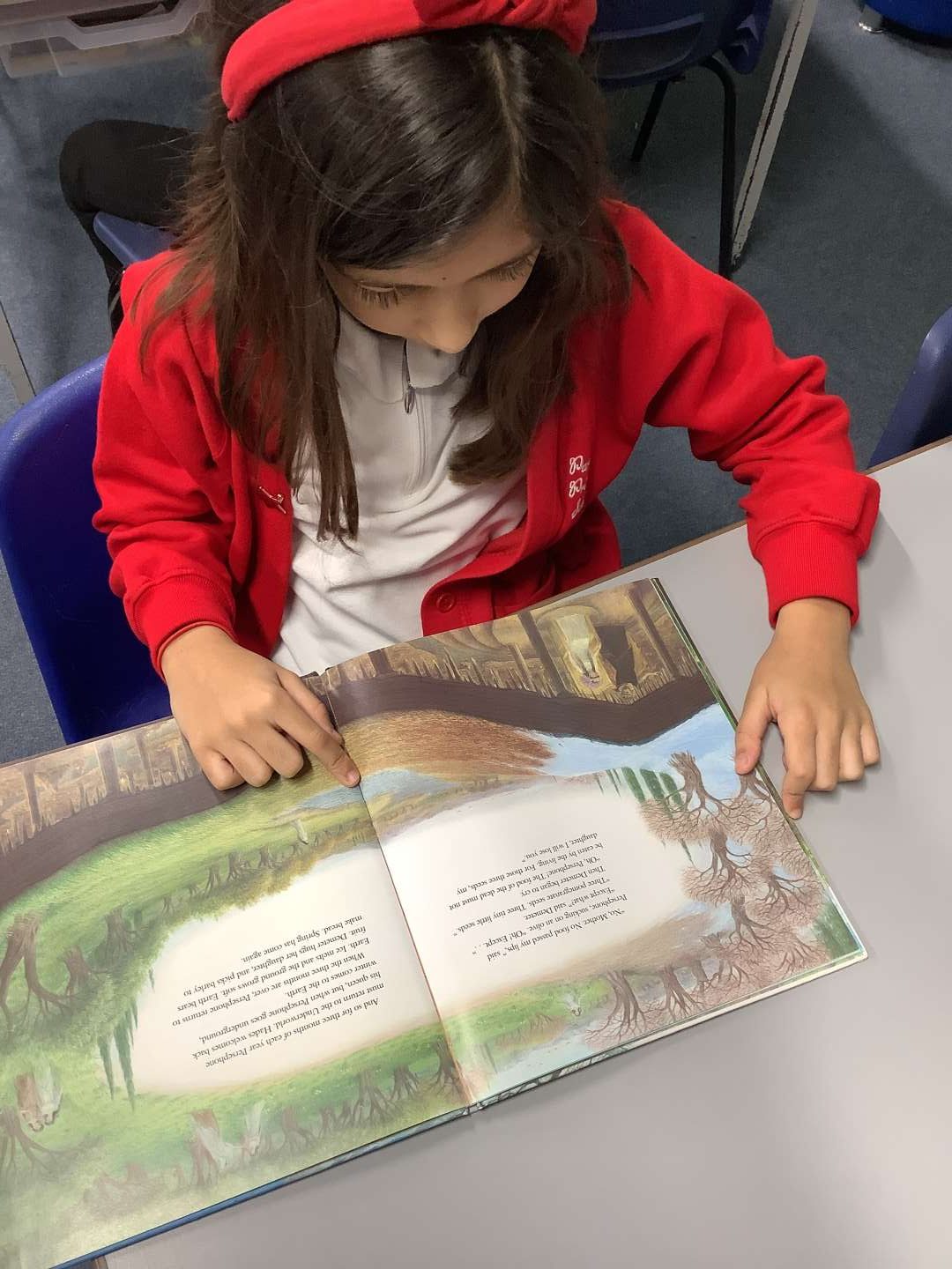 During our reading sessions, we have been exploring the text of Persephone. We have been discussing the thoughts, feelings and actions of the characters of Persephone, Hades and Demeter and how these are revealed through the text and the illustrations. We have also been focusing upon using expression when reading aloud to convey character to our listener.